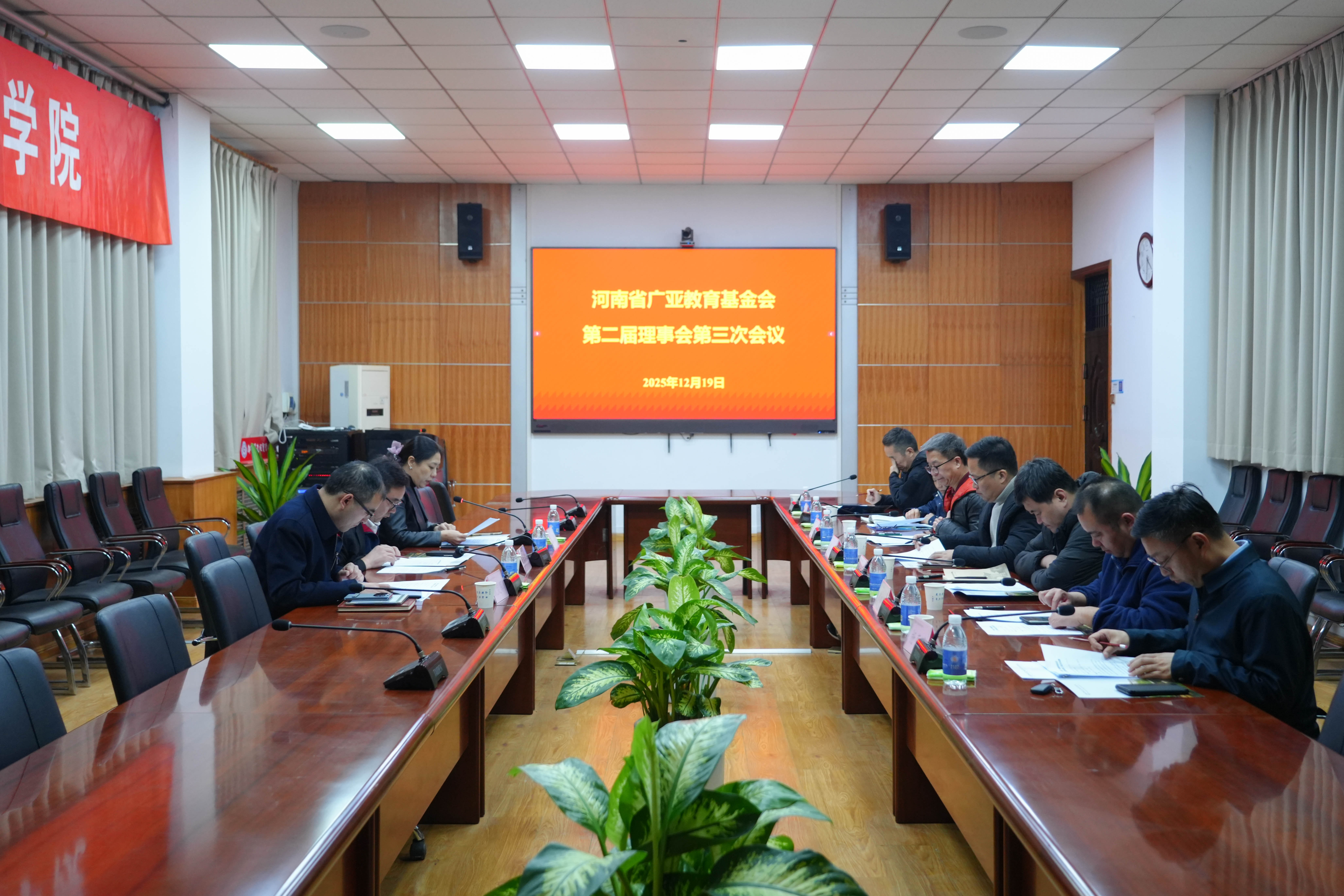 2025年12月19日下午,河南省广亚教育基金会召开了第二届理事会第三次会议。名誉理事长王新奇、理事长秦旻、常务副理事长沈定军、秘书长刘昊等全体理事出席会议,监事李博列席会议,列席本次会议的还有郑州升达经贸管理学院董事会办公室主任杨存博、法律顾问花金昌。会议由理事长秦旻主持。
