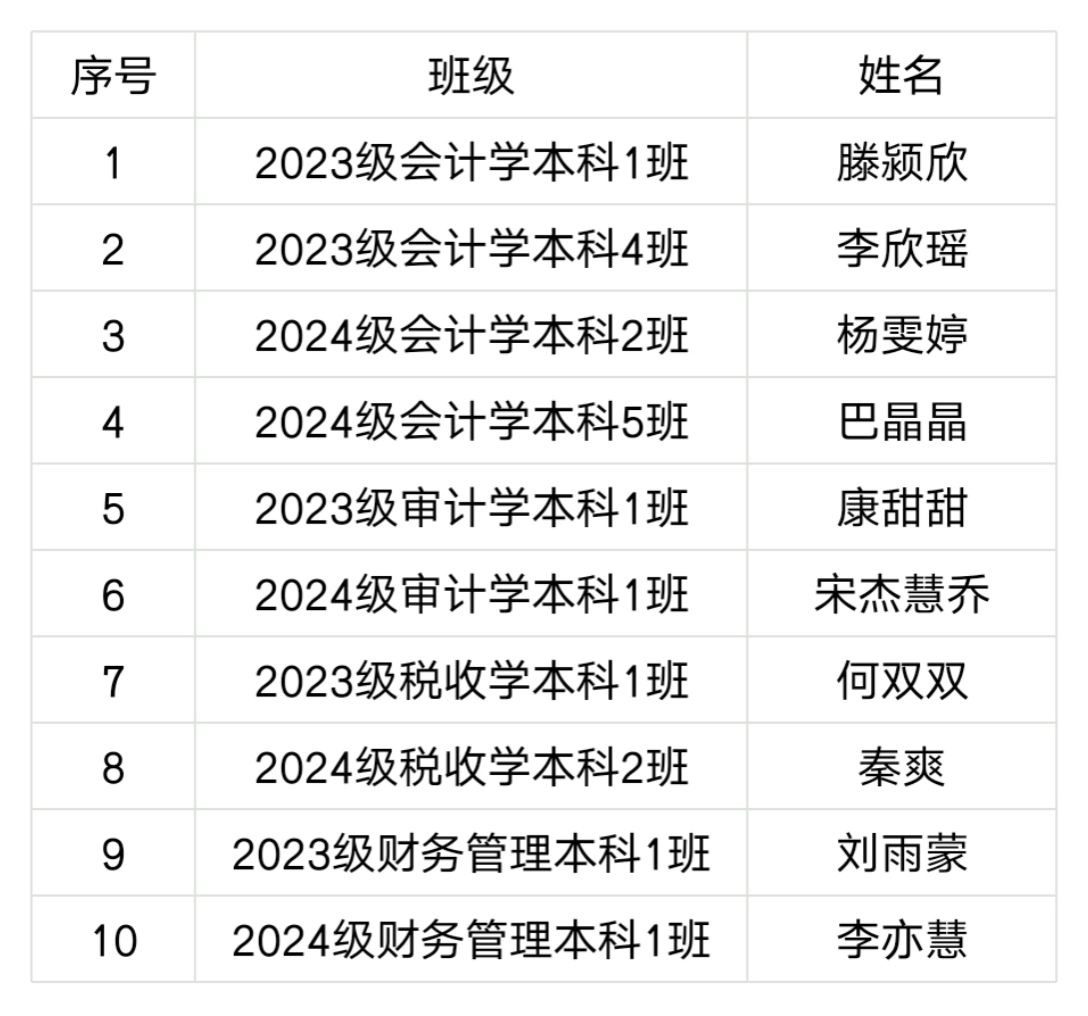 河南省广亚教育基金会根据《会计学院学长奖学金评选管理办法》,本着公平、公正、公开的原则组织开展评审工作,经个人申报、资格审查、综合审议等程序,2025年度会计学院学长奖学金共评选出10人,现将评审结果公示如下: