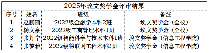 河南省广亚教育基金会根据《埃文奖学金评选管理办法》与《外国语学院聚力奖学金评选管理办法》,本着公平、公正、公开的原则组织开展评审工作,经个人申报、资格审查、综合审议等程序,2025年度埃文奖学金共评选出4人,外国语学院聚力奖学金共评选出5人,现将评审结果公示如下: