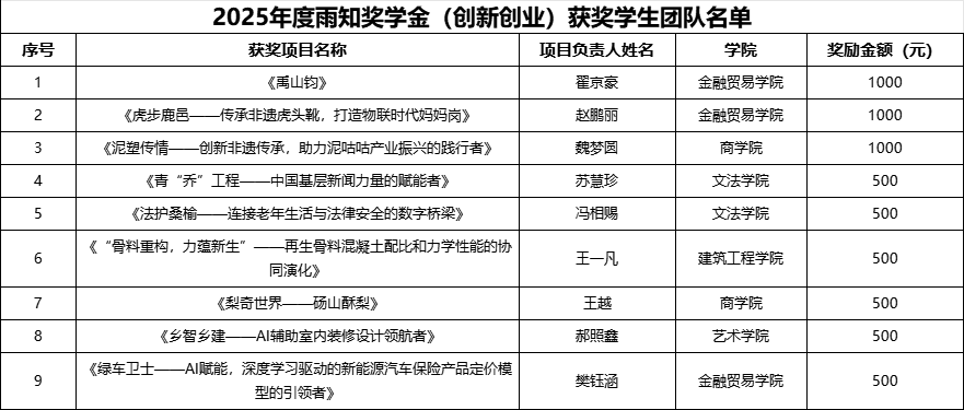 根据《雨知奖学金评审管理办法》,将对在中国国际大学生创新大赛河南赛区选拔赛中获奖的学生团队进行奖励。依据河南省教育厅《关于公布中国国际大学生创新大赛(2025)河南赛区选拔赛获奖名单的通知》,拟对以下9支学生团队进行奖励: