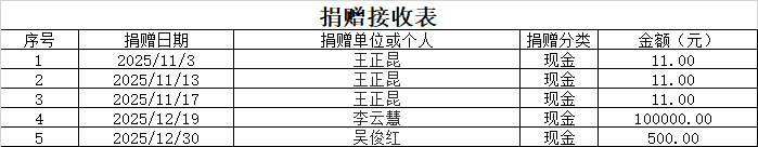 2025年11月—12月,河南省广亚教育基金会接收来自爱心人士的捐赠款项共计5笔。具体捐赠明细详见下图:
