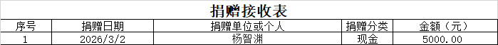 2026年3月,河南省广亚教育基金会接收来自爱心人士的捐赠款项共计1笔。具体捐赠明细详见下图: